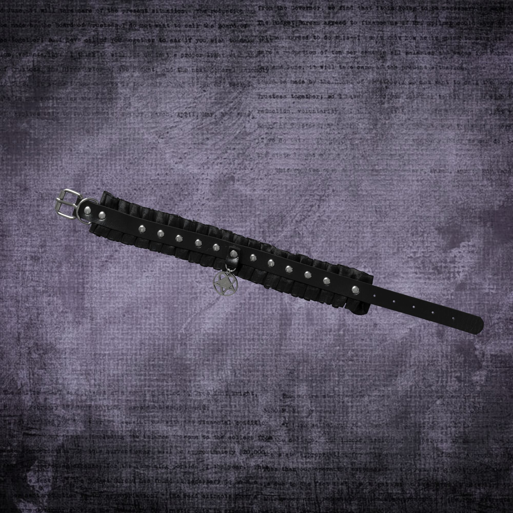 レザー風素材にたくさんのフリル、Scyrayの¨S¨の五芒星デザインが可愛いメタルチャームチョーカー。